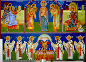 Seinämaalausten aiheet noudattavat Ortodoksisen kirkon perinteistä kuvaohjelmaa. Koska itä on alttarin suunta, ylätasolle on kuvattu ylienkeli Gabrielin ilmestyminen neitsyt Marialle eli Kristuksen syntymän ilmoitus ja alatasolle kuusi varhaisvuosisatojen suurta kirkkoisää kahtena symmetrisenä ryhmänä. Kaikkien katse suuntautuu kohti ryhmien keskelle maalattua alttaripöytää ja sille ehtoollismaljassa kuvattua Kristus-lasta. Kirkkoisien kannattelemissa avoimissa kirjakääröissä on poimintoja ortodoksisen liturgiapalveluksen teksteistä.